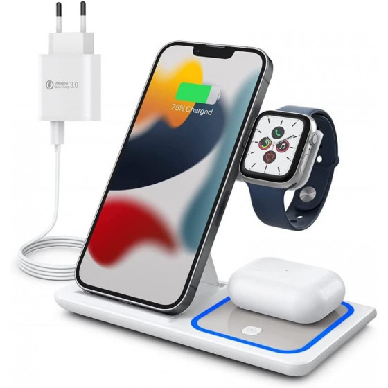 G-TELWARE® 3/4 en 1 plegable, carga inalámbrica, carga por inducción QI para iPhone/iWatch/Airpod/Android (3 en 1, BLANCO NIEVE)